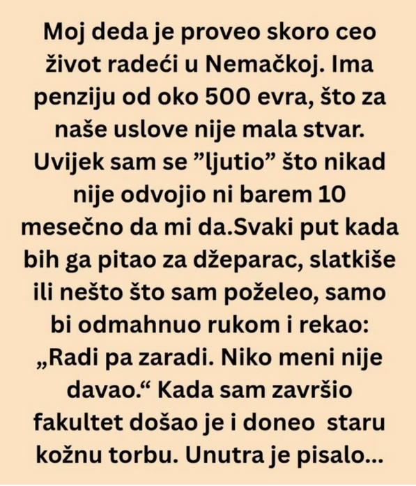 No, uvijek mi je smetalo jedno pitanje – zašto mi nikada nije pomogao? Kada sam diplomirao, obitelj se okupila da proslavi taj važan trenutak u mom životu. Deda je došao, kao uvijek, ozbiljan, u svom tamnom odijelu, s kožnim koferom koji je nosio godinama. Tada je došao trenutak koji ću pamtiti. Bez puno riječi, samo je prišao, pružio mi torbu i rekao: „Da kupiš sebi posao.“