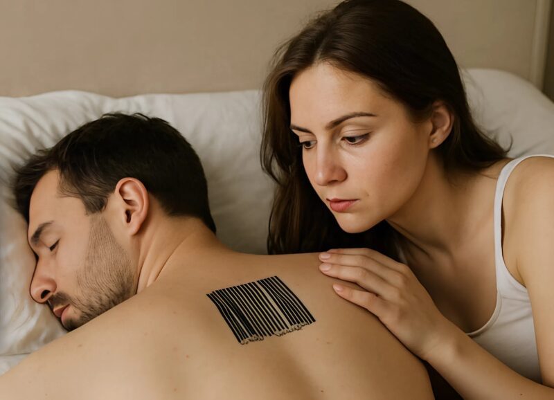 Jednog noćnog trenutka, dok je njen muž spavao, primijetila je nešto neobično. Na njegovim leđima, tik uz vrat, bila je nova tetovaža koju ranije nije primijetila. U početku je to izgledalo kao običan umjetnički izraz, no ubrzo je shvatila da je u pitanju nešto mnogo ozbiljnije. Tetovaža nije bila samo simbol; to je bio šifrirani kod, nalik barcode-u, koji je signalizirao pripadnost nekom mračnom svetu. Osjećaj nelagode obuzeo ju je dok je razmišljala o značenju ovog otkrića. Kakva bi to tajna mogla biti iza tog neobičnog znaka na njegovom tijelu?