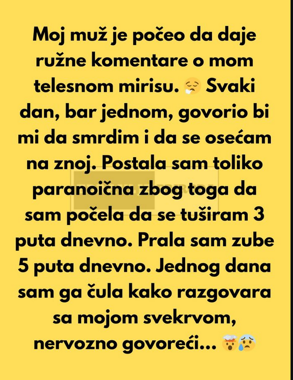 - Lili je postala paranoična i preterano zabrinuta zbog svog mirisa. Počela je da se tušira više puta dnevno, stavljajući dezodorans nekoliko puta u toku dana, čak je koristila parfem i prala zube više puta nego što je bilo potrebno. Pokušala je da uradi sve kako bi zadovoljila svog muža, ali ništa nije pomoglo. Lili je postajala sve više nesigurna i mentalno iscrpljena. Bila je sigurna da nije loše mirisala, ali njeno samopouzdanje je počelo da se sruši pod težinom njegovih svakodnevnih primedbi.