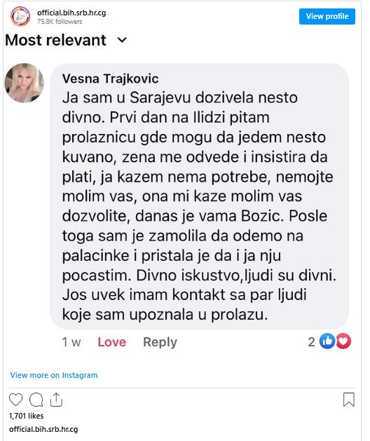 Nepoznata žena je preporučila Vesni jela i, nakon što su zajedno pojele, otkrila je da mora otići. Vesna se zahvalila s osjećajem koji je teško bilo opisati riječima. Odlazila je s osjećajem da je upravo ispratila blisku prijateljicu, a ne samo prolaznu poznanicu. To nije bio običan obrok; to je bila lekcija o gostoprimstvu, ljubaznosti i o tome kako mali gestovi mogu ostaviti dubok trag u srcima ljudi. Kada se vratila u Beograd, Vesna je radila nešto posebno – pričala je svima o toj Sarajki, koja je ostavila neizbrisiv pečat u njenom životu. Ova priča se širila među njenim prijateljima i kolegama, inspirirajući ih da razmišljaju o vlastitim iskustvima i kako mogu doprinijeti pozitivnim promjenama u svijetu oko sebe.